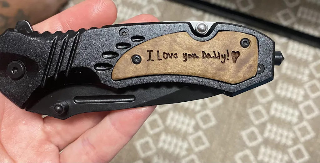 Get your actual handwriting laser engraved on this black pocket knife to create the perfect personalized gift that will be cherished for years to come. This unique feature allows you to transform handwritten sentiments into a permanent keepsake, adding a deeply personal touch to a practical tool. Whether you’re marking a special occasion, expressing love and gratitude, or simply wanting to add a personal flair, this custom engraving option turns this standard pocket knife into a unique memento that speaks from the heart. Perfect for birthdays, anniversaries, or ‘just because,’ your words will be a timeless reminder of the bond you share with the recipient.